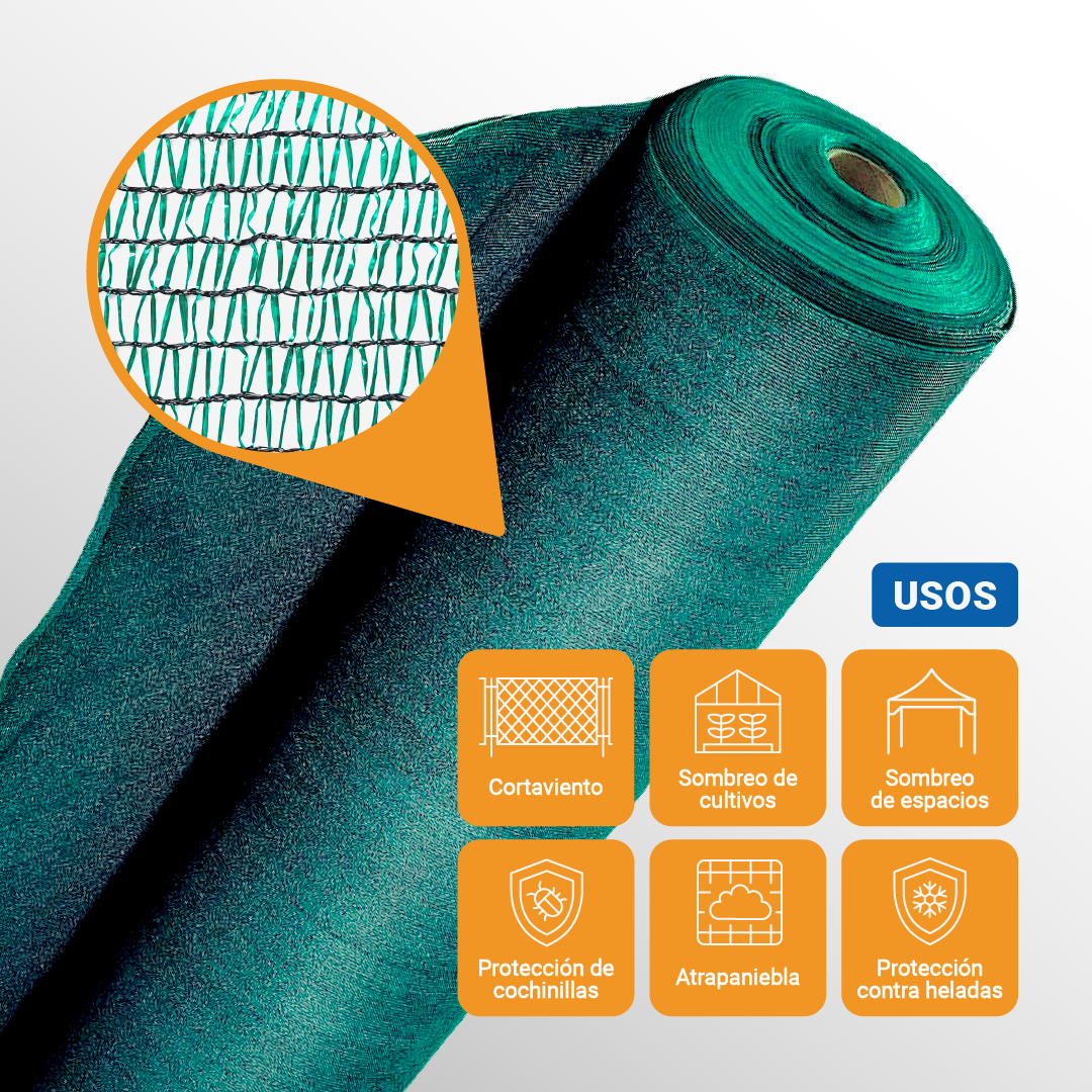 La malla Raschel 35% verde/negro de Sajotex es una tela tejida con rafias de polietileno de alta densidad, diseñada para ofrecer resistencia, durabilidad y protección en diversas aplicaciones industriales, agrícolas y de construcción.