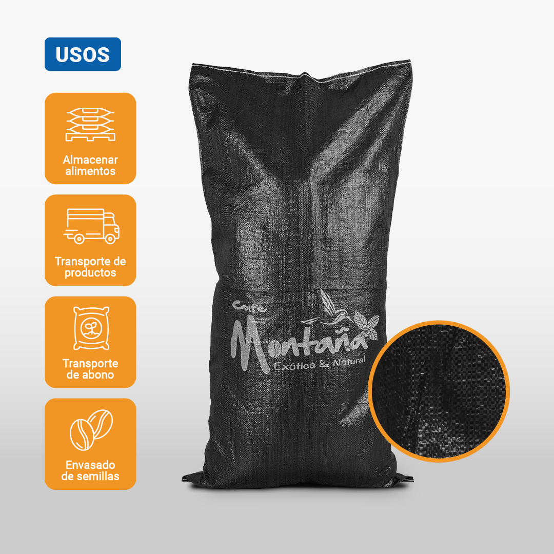 Su color negro permite mayor protección contra la exposición solar y acumulación de suciedad, mientras que su estructura tejida mantiene los productos frescos y aireados. Además, permite impresión personalizada, ideal para destacar tu marca o identificar el contenido del saco.