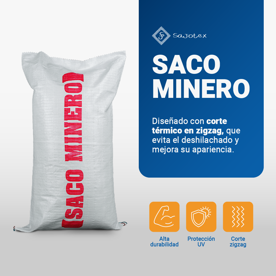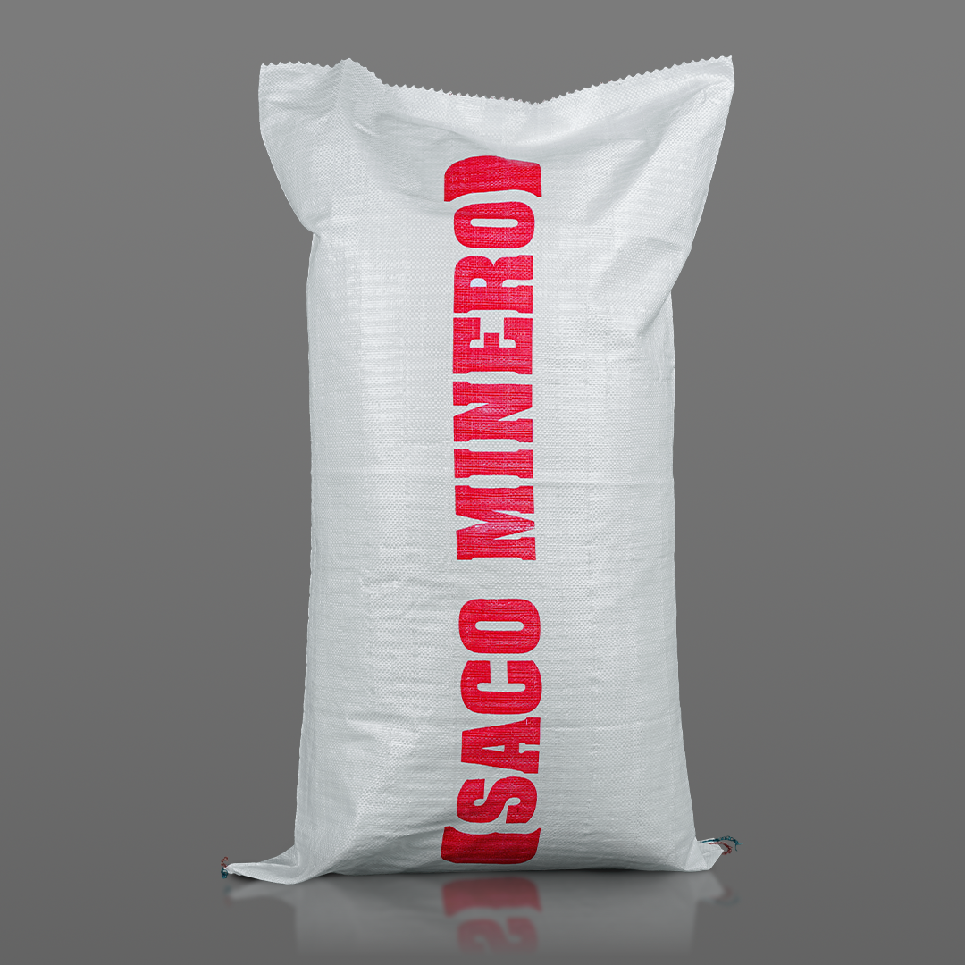 El saco tejido de polipropileno blanco para uso minero de Sajotex, también conocido como saco minero, es un envase de alta resistencia diseñado para soportar cargas pesadas en ambientes industriales y mineros.
