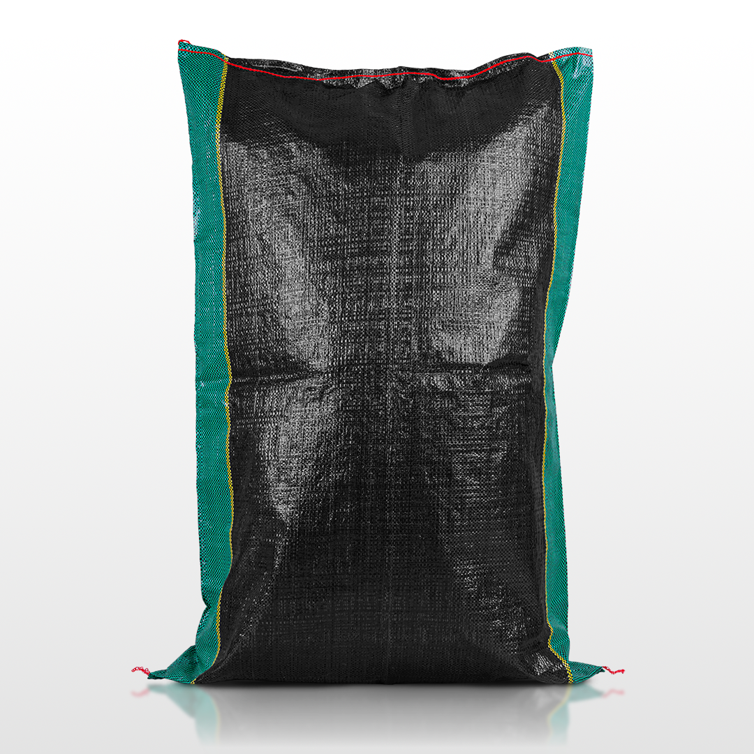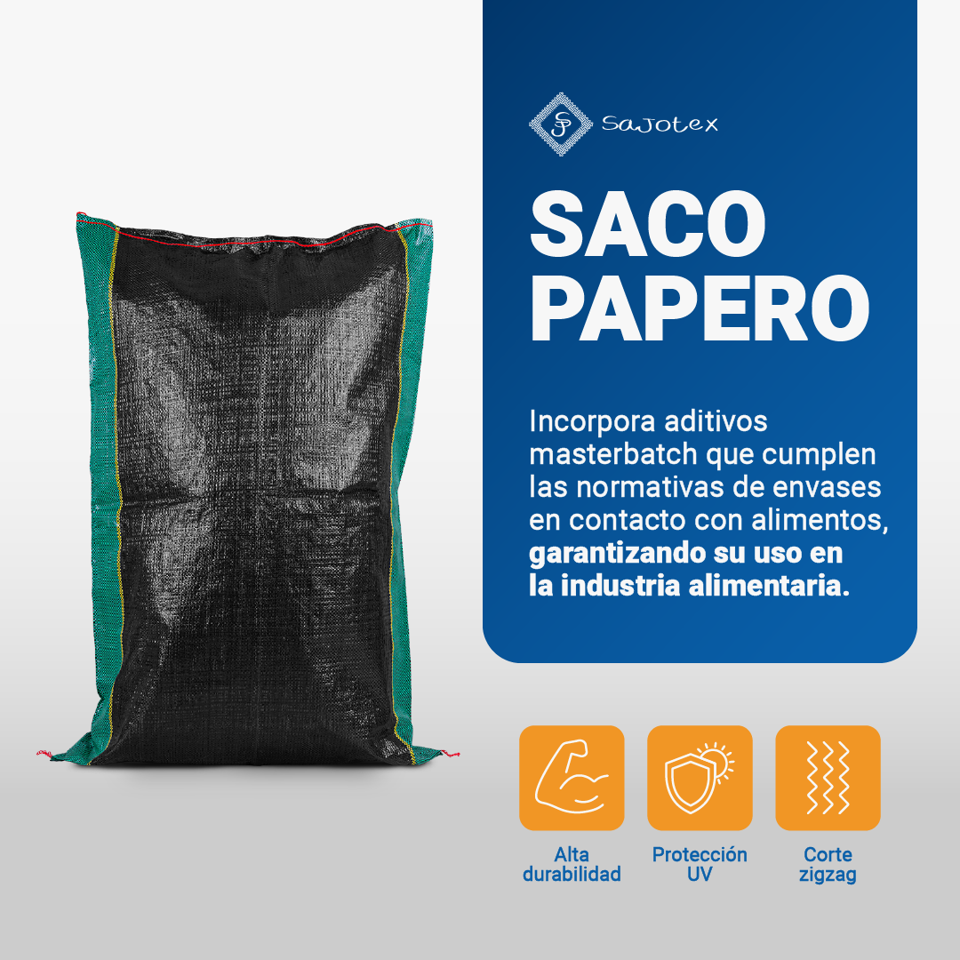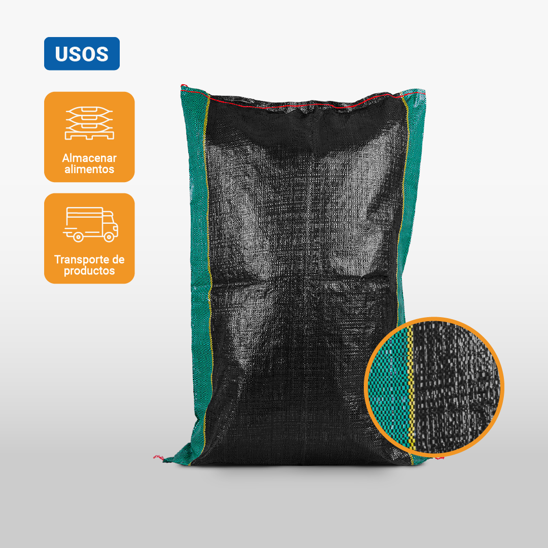 El saco tejido de polipropileno negro con franjas verdes de Sajotex, también conocido como saco papero verde, está diseñado para el almacenamiento y transporte de alimentos, especialmente tubérculos como papa, yuca o camote.