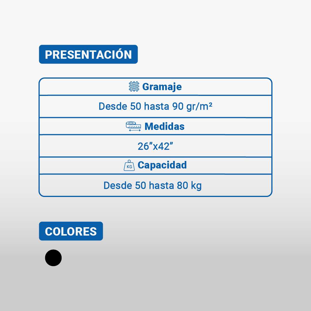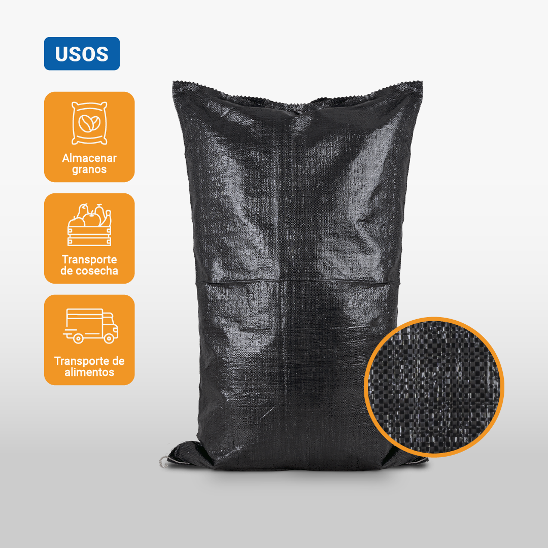 Este saco es ampliamente usado por su capacidad de carga, facilidad de manipulación y durabilidad. Su color negro ofrece mayor discreción ante manchas y exposición solar, y permite la impresión personalizada con logos o información de identificación.
