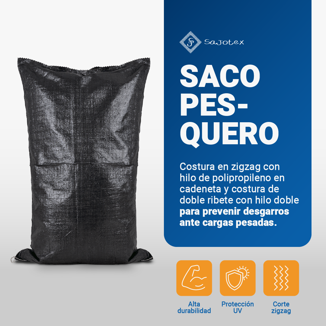El saco pesquero de polipropileno tejido negro 26x42 pulgadas de Sajotex es un envase rectangular abierto por un extremo, confeccionado con cintas tejidas de rafia que permiten una excelente ventilación y resistencia. Su estructura está diseñada para facilitar el transporte y almacenamiento de productos pesqueros en ambientes húmedos o con exposición constante al agua y al movimiento.