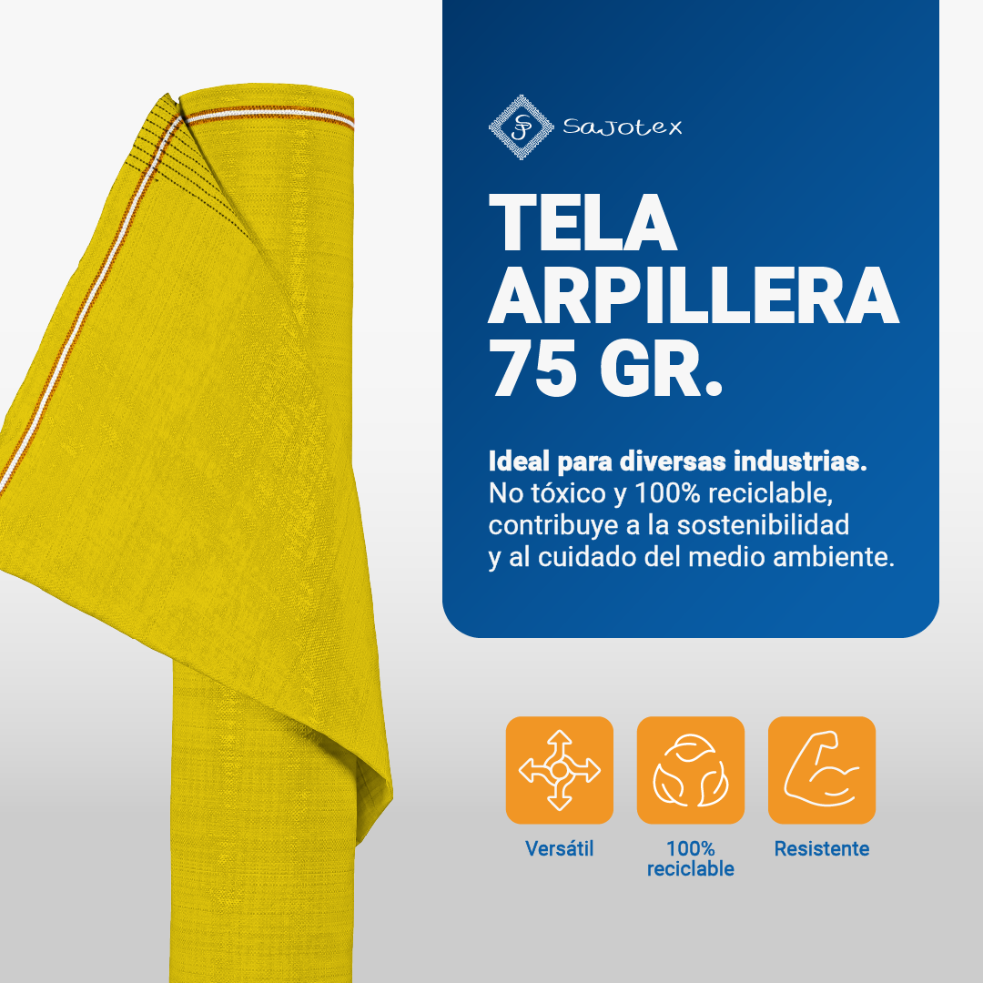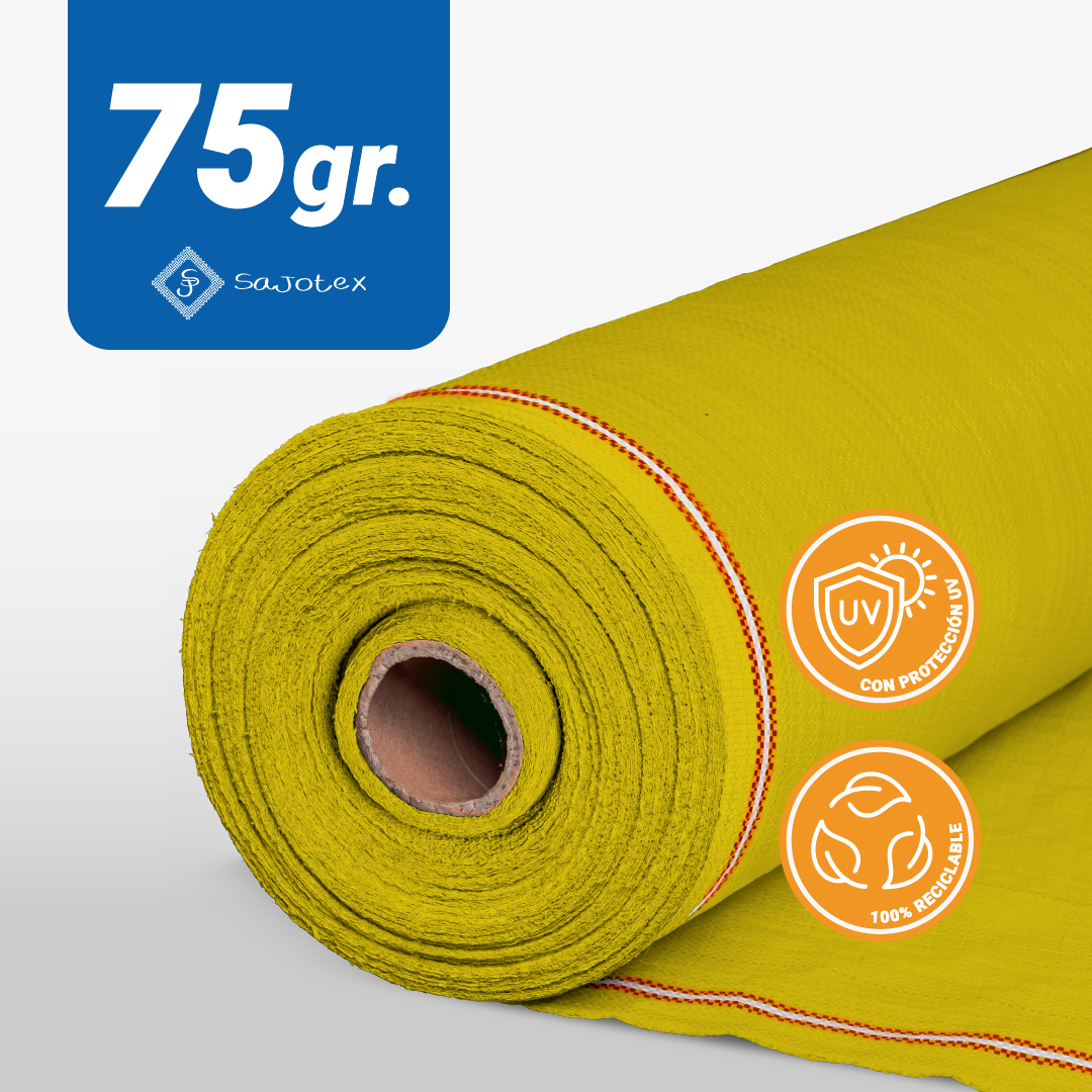 La tela arpillera amarillo 75 gr de Sajotex es una tela tubular confeccionada mediante el entrelazado de hilos y cintas de polipropileno 100%, conocida por su combinación de ligereza y resistencia. Esta tela se fabrica con cintas de rafia de polipropileno, lo que le otorga una excelente resistencia a la tracción y al desgarro.